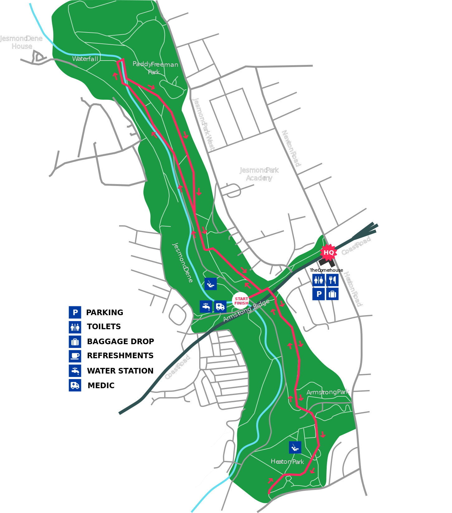 The Anita Nott course is an undulating 5k route starting and finishing on Armstrong Bridge over Jesmond Dene. The route can be seen below or Click Here for the Course Map.
